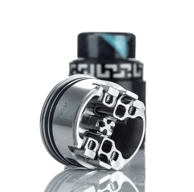Die El RDA RUNE VERSION misst 24,2 mm im Durchmesser und wird elegant in einem Spektrum farbenfroher Designs aus Edelstahl mit exklusiven, mit 810-Harz gefärbten Mundstücken angeboten. Die interne Aufbauplattform ist vergoldet und mit einer zweipoligen Aufbauplattform ausgestattet, auf der die Widerstandskabel auf den Klemmenregalen platziert und mit oben montierten Flachkopfschrauben gesichert werden. Der Luftstrom gelangt durch zwei breite äußere Luftschlitze in die Struktur, die in die vier inneren Luftrohre führen, um Luftkanäle direkt zu den Spulen zu liefern.